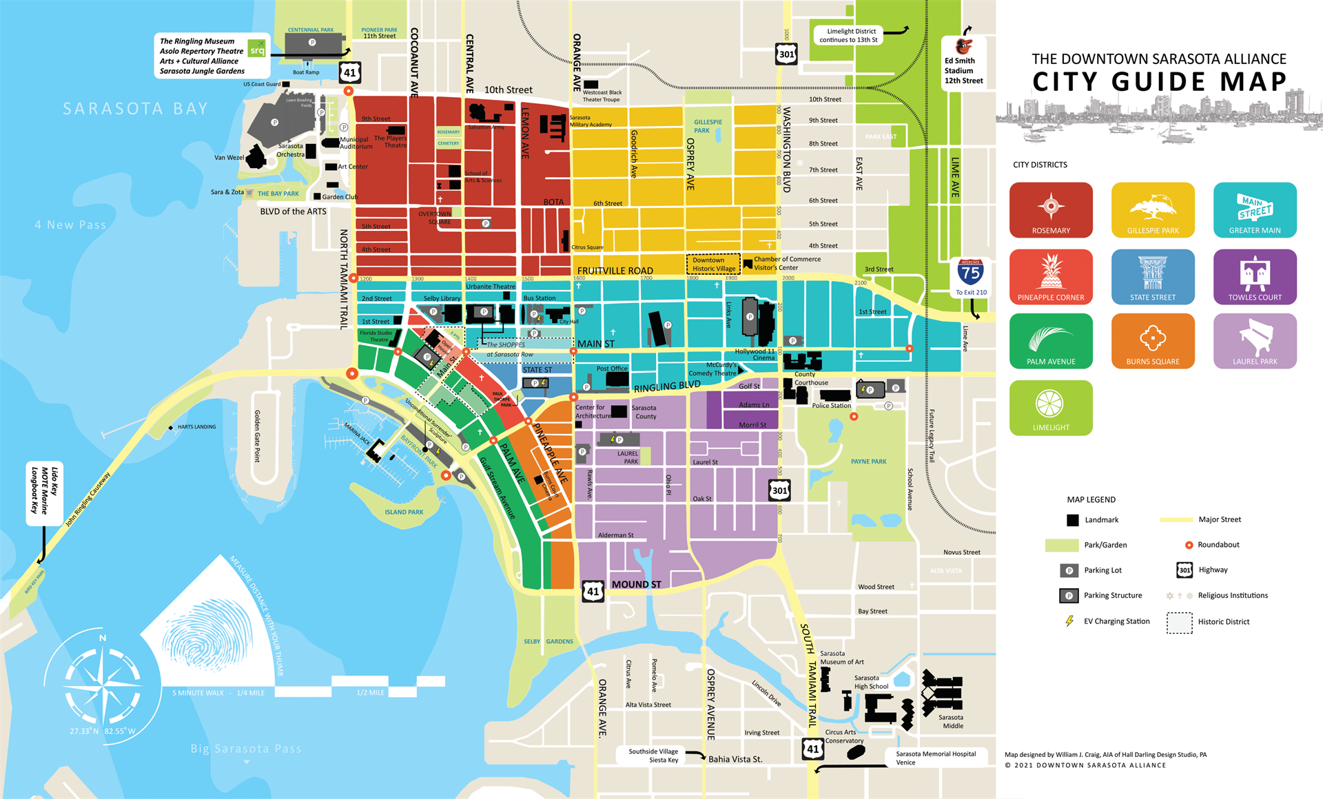 The Downtown Sarasota City Guide is organized by districts/areas and color coded for easy to find landmarks on the folded map located in the center of the City Guide.